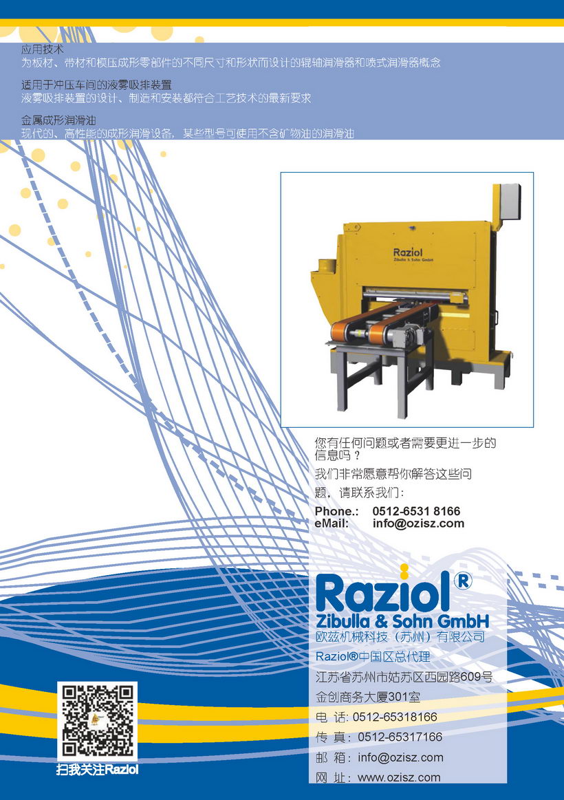 "歐茲?rùn)C(jī)械科技(蘇州)有限公司"是目前是德國(guó)Raziol潤(rùn)滑系統(tǒng)在中國(guó)的總代理,在金屬成形潤(rùn)滑領(lǐng)域行業(yè)內(nèi)屬于尖端產(chǎn)品,所銷售的產(chǎn)品遍布化工,電力,水力,工業(yè)自動(dòng)化,模具制造,汽車(chē)制造及各個(gè)工業(yè)領(lǐng)域,是提供各類制造企業(yè),貿(mào)易商,使用人生產(chǎn)制造潤(rùn)滑系統(tǒng)解決方案的綜合型銷售供應(yīng)服務(wù)商。