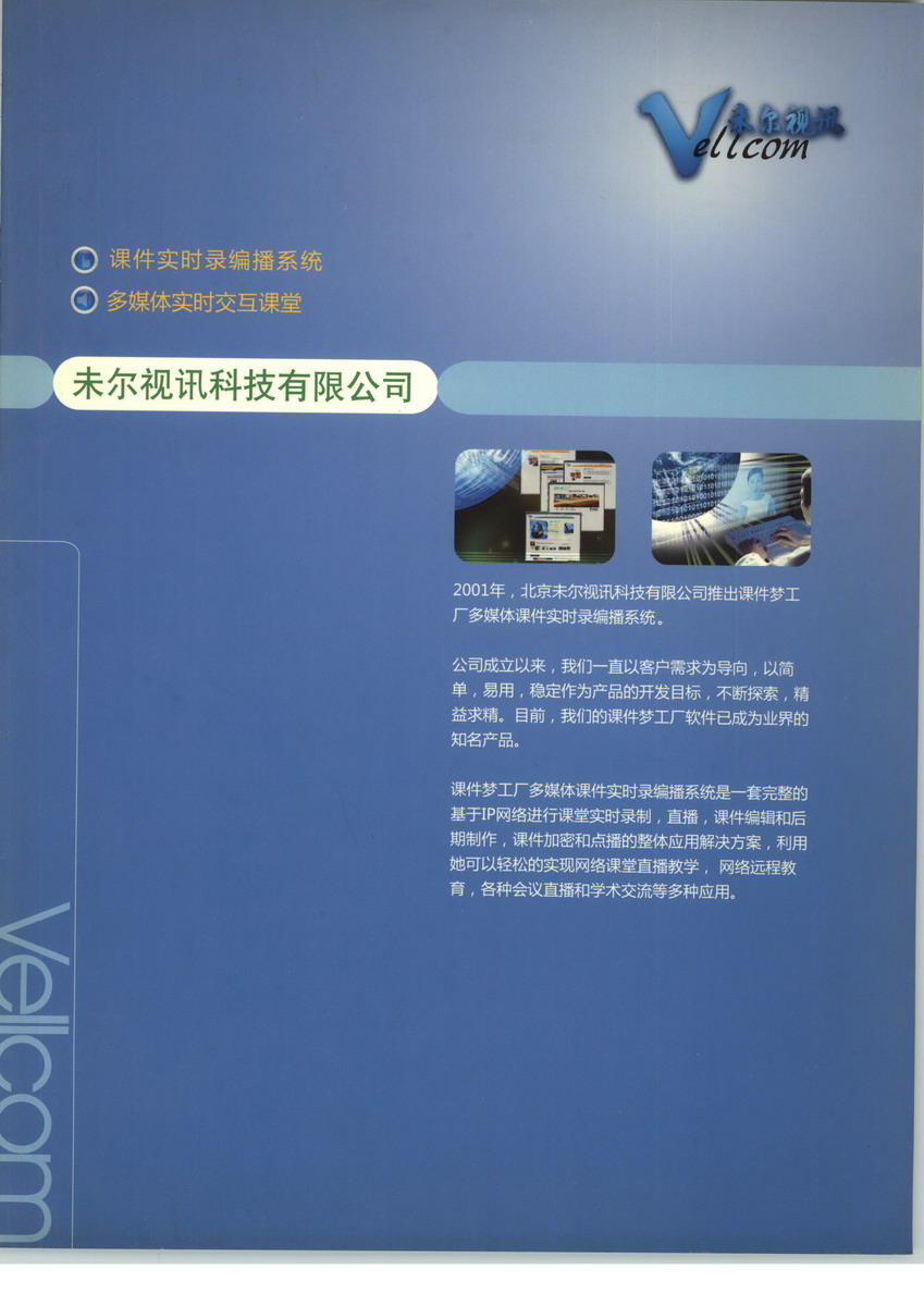 北京未爾視訊科技有限公司(Beijing Vellcom Technology Co. ,Ltd )成立于2002年,位于北京市海淀區(qū)上地中關(guān)村國家留學創(chuàng)業(yè)園,是由美國硅谷留學科研人員創(chuàng)辦的具有自主知識產(chǎn)權(quán)的高新技術(shù)企業(yè),專業(yè)致力于手持移動終端的軟硬件設(shè)計,多媒體通信軟件及圖像處理技術(shù)的研究開發(fā)和銷售,公司所有員工均擁有大學以上學歷,研發(fā)人員主要來自清華大學,技術(shù)帶頭人為多媒體和移動通信領(lǐng)域的留美博士,有多年的海外工作經(jīng)歷和產(chǎn)品研發(fā)經(jīng)驗,公司強大的技術(shù)研發(fā)團隊,為公司研發(fā)一流產(chǎn)品提供了強有力的技術(shù)保障。公司產(chǎn)品包括手持終端移動考勤系統(tǒng),課件夢工廠工具軟件系列、實時互動直播課堂系統(tǒng)、資源管理系統(tǒng)、數(shù)字版權(quán)管理系統(tǒng)等。我們的用戶遍及全國各地并已經(jīng)開始進入海外市場,國內(nèi)成功的用戶包括國家發(fā)改委,中國海關(guān),中國銀行,國家質(zhì)監(jiān)總局,中國移動通信公司,北京大學、清華大學、中國人民大學、北京航空航天大學、北京師范大學、中山大學、西北工業(yè)大學等各類用戶群體。