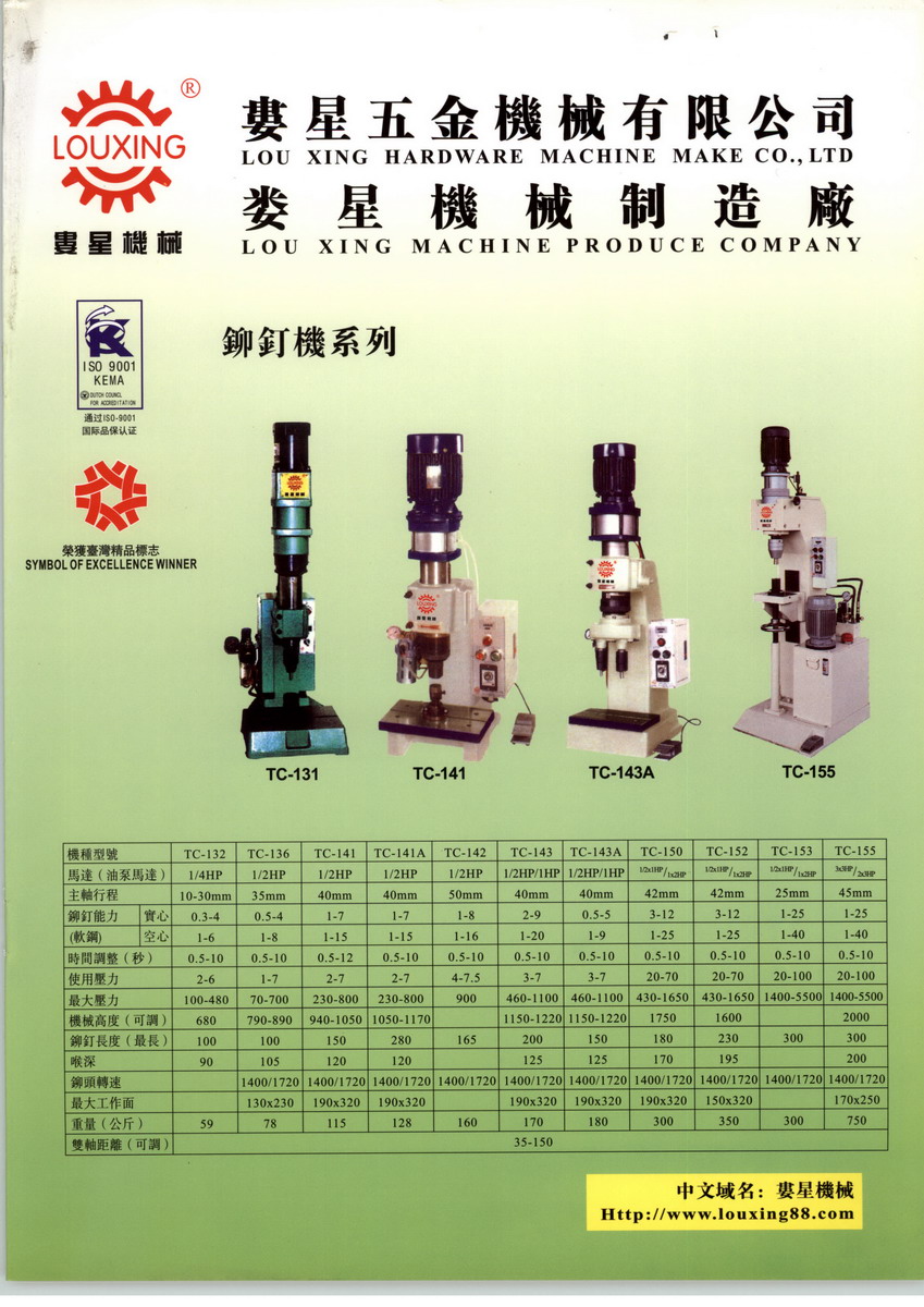 東莞市婁星五金機(jī)械有限公司,臺(tái)灣成立于1976年;大陸東莞成立于2000年;江蘇昆山成立于2003年。是集設(shè)計(jì),開發(fā),制造,銷售于一體的機(jī)械生產(chǎn)廠家。并以引進(jìn)日本、臺(tái)灣等先進(jìn)技術(shù)及電子元件,開發(fā)及制造:攻牙機(jī)、鉚釘機(jī)、鉆孔機(jī)、刀具設(shè)定儀、齒輪式攻牙機(jī)、多軸鉆孔攻牙器、空油壓鉚釘機(jī)、撞釘機(jī)、高速鉆孔機(jī)、磁性鉆孔攻牙機(jī)、非標(biāo)專用機(jī)械、沖床周邊機(jī)械設(shè)備等。所生產(chǎn)的機(jī)械廣泛適用于汽車、摩托車、單車、壓鑄、五金、電子、燈飾、運(yùn)動(dòng)器材、沙灘椅、燒烤爐等行業(yè)。配合生產(chǎn)的實(shí)心釘,中空釘品種齊全, 品質(zhì)保證。深受廣大用戶好評(píng),產(chǎn)品廣銷日本、臺(tái)灣、東南亞及國(guó)內(nèi)各省!