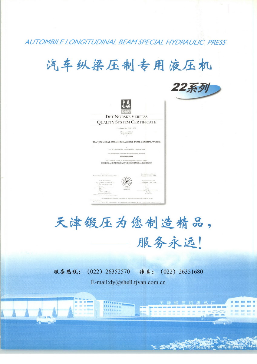 天津市鍛壓機(jī)床總廠是我國起步最早的企業(yè),現(xiàn)有固定資產(chǎn)2.4億元各類專業(yè)技術(shù)人員480人,是機(jī)戒部大型骨干企業(yè)。自我廠自行設(shè)計(jì)國內(nèi)第一臺液壓機(jī),開創(chuàng)了我國中小型液壓機(jī)生產(chǎn)歷史以來,目前擁有26個系列,300余品種,產(chǎn)品從80KN至5000KN,以形成年產(chǎn)1200臺各類液壓機(jī)的生產(chǎn)能力,居國內(nèi)同行業(yè)之首。1983年YT32-315四柱液壓機(jī)獲國家銀牌,1990年YT32-630/1030雙動力拉伸液壓機(jī)一舉榮獲同行業(yè)唯一的國家金獎另有部優(yōu)產(chǎn)品3項(xiàng),市優(yōu)產(chǎn)品5項(xiàng)。產(chǎn)品廣泛適用于汽車制造、粉末冶金、金屬冷擠、輕工家電、化工機(jī)戒、航空航天、模具磨料、機(jī)戒制造等行業(yè),被國家指定為替代進(jìn)口產(chǎn)品,行銷全國,產(chǎn)品出口到日本、荷蘭、東南亞等20多個地區(qū)和國家、市場占有率居全國同行業(yè)第一。另有部優(yōu)產(chǎn)品3項(xiàng),市優(yōu)產(chǎn)品5項(xiàng)。產(chǎn)品廣泛適用于汽車制造、粉末冶金、金屬冷擠、輕工家電、化工機(jī)戒、航空航天、模具磨料、機(jī)戒制造等行業(yè),被國家指定為替代進(jìn)口產(chǎn)品,行銷全國,產(chǎn)品出口到日本、荷蘭、東南亞等20多個地區(qū)和國家、市場占有率居全國同行業(yè)第一。作為機(jī)戒部科技進(jìn)步示范企業(yè),充分發(fā)揮全國唯一的液壓機(jī)研究所設(shè)在我廠的技術(shù)優(yōu)勢,在帶領(lǐng)液壓行業(yè)提高技術(shù)水平的同時,以快速的科技進(jìn)步適應(yīng)市場,采用CAD工作站和CAM計(jì)算機(jī)輔助設(shè)計(jì),率先在國內(nèi)成功的采用了比例控制技術(shù)、位置數(shù)字控制技術(shù)、同步控制技術(shù)、觸摸屏技術(shù)等先進(jìn)技術(shù),使產(chǎn)品技術(shù)水平一直處于國內(nèi)領(lǐng)先地位。
