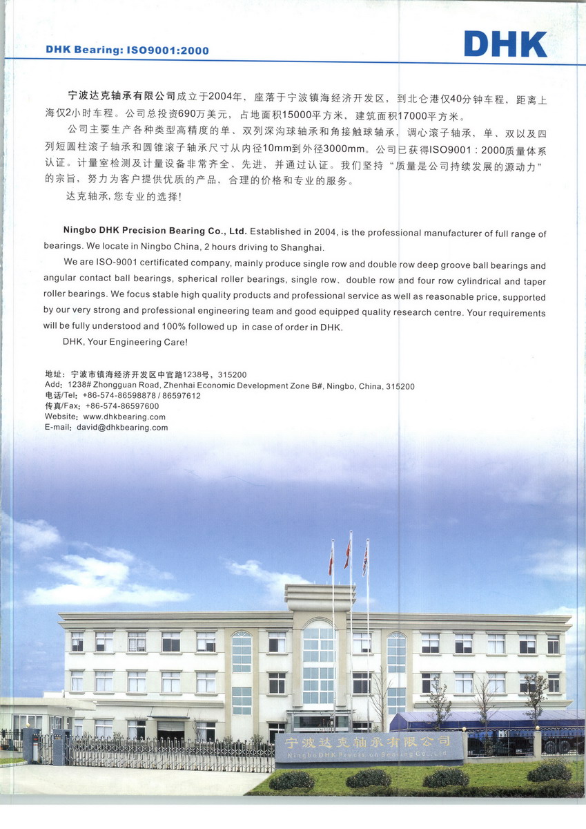 寧波達克軸承有限公司(DHK)是一家專業(yè)從事軸承研發(fā)、生產(chǎn)和銷售的企業(yè),位于交通便利的寧波鎮(zhèn)海經(jīng)濟開發(fā)區(qū)。公司自成立至今,十余年來,一直將“技術(shù)”、“品質(zhì)”和“服務(wù)”作為企業(yè)發(fā)展之本,為世界級重工企業(yè)長期提供質(zhì)量可靠的產(chǎn)品和專業(yè)定制化的服務(wù),獲得了眾多海內(nèi)外一流企業(yè)的滿意和好評。DHK主要生產(chǎn)圓柱滾子軸承、圓錐滾子軸承、調(diào)心滾子軸承、球軸承以及各類非標(biāo)準(zhǔn)軸承和特殊表面處理軸承。目前,DHK的產(chǎn)品在歐美發(fā)達國家已被廣泛應(yīng)用于工程機械、工業(yè)泵、機床、風(fēng)電、冶金等領(lǐng)域。DHK現(xiàn)已擁有行業(yè)領(lǐng)先的軸承計量室和檢測中心,并引進國內(nèi)外尖端的檢測設(shè)備,建立了國內(nèi)領(lǐng)先的質(zhì)控體系,全面保證了產(chǎn)品質(zhì)量。作為重工軸承解決方案優(yōu)化專家,DHK具有為客戶提供從產(chǎn)品選型、性能測試、力學(xué)分析、應(yīng)用分析、個性化產(chǎn)品設(shè)計與生產(chǎn)、產(chǎn)品優(yōu)化、維修服務(wù)等方面的專業(yè)技術(shù)服務(wù)的能力。