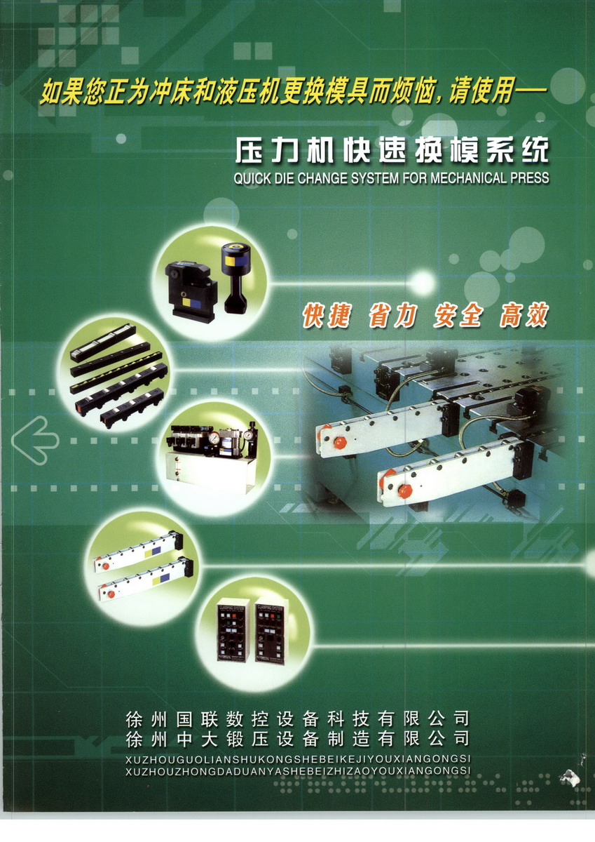 徐州國聯(lián)數(shù)控設(shè)備科技有限公司是一家集機(jī)電產(chǎn)品研發(fā)、生產(chǎn)、銷售與一體的高新科技企業(yè),擁有機(jī)械、液壓、電器行業(yè)工程師多名,有較強(qiáng)的自主設(shè)計(jì)能力,為“徐州中大鍛壓”提供強(qiáng)有力的技術(shù)保證。由“國聯(lián)數(shù)控”研發(fā)、“中大鍛壓”生產(chǎn)的快速換模系統(tǒng),是采用國外先進(jìn)技術(shù)開發(fā)生產(chǎn)的自動(dòng)化程度高、省力、快速的換模系統(tǒng)。廣泛應(yīng)用于沖床、油壓機(jī)、壓鑄機(jī)、注塑機(jī)和汽車制造等行業(yè),它可以使您在幾分鐘之內(nèi)完成模具的更換和加緊工作,對降低成本、減輕勞動(dòng)強(qiáng)度、提高生產(chǎn)效率提供了安全、快捷的保證。特別適用于產(chǎn)品的小批量、多樣化生產(chǎn)。我們以“誠信”為企業(yè)發(fā)展之本,以“永遠(yuǎn)讓顧客滿意”為宗旨,竭誠為您提供優(yōu)質(zhì)的產(chǎn)品和良好的服務(wù)。我們充分認(rèn)識(shí)到,企業(yè)做大做強(qiáng)、可持續(xù)發(fā)展“任重而道遠(yuǎn)”,與國外先進(jìn)企業(yè)相比,還需要加倍努力。我們將把過去成功的業(yè)績當(dāng)成“持續(xù)發(fā)展的資本和基石”,為民族工業(yè)的發(fā)展作出應(yīng)有的貢獻(xiàn)。