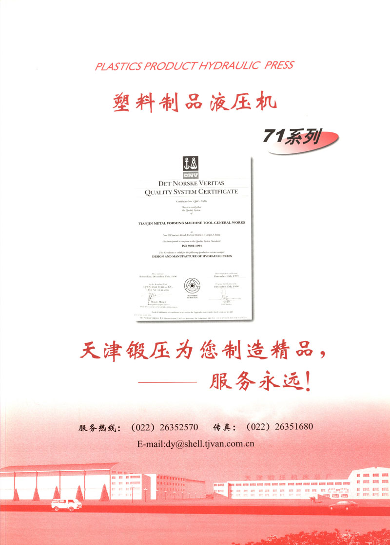 天津市鍛壓機(jī)床總廠是我國起步最早的企業(yè),現(xiàn)有固定資產(chǎn)2.4億元各類專業(yè)技術(shù)人員480人,是機(jī)械部大型骨干企業(yè)。自我廠自行設(shè)計國內(nèi)第一臺液壓機(jī),開創(chuàng)了我國中小型液壓機(jī)生產(chǎn)歷史以來,目前擁有26個系列,300余品種,產(chǎn)品從80KN至5000KN,以形成年產(chǎn)1200臺各類液壓機(jī)的生產(chǎn)能力,居國內(nèi)同行業(yè)之首。1983年YT32-315四柱液壓機(jī)獲國家銀牌,1990年YT32-630/1030雙動力拉伸液壓機(jī)一舉榮獲同行業(yè)唯一的國家金獎另有部優(yōu)產(chǎn)品3項(xiàng),市優(yōu)產(chǎn)品5項(xiàng)。產(chǎn)品廣泛適用于汽車制造、粉末冶金、金屬冷擠、輕工家電、化工機(jī)戒、航空航天、模具磨料、機(jī)戒制造等行業(yè),被國家指定為替代進(jìn)口產(chǎn)品,行銷全國,產(chǎn)品出口到日本、荷蘭、東南亞等20多個地區(qū)和國家、市場占有率居全國同行業(yè)第一。