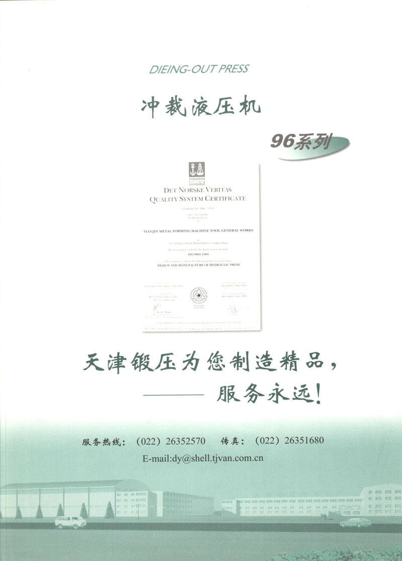 天津市鍛壓機(jī)床總廠是我國(guó)起步最早的企業(yè),現(xiàn)有固定資產(chǎn)2.4億元各類專業(yè)技術(shù)人員480人,是機(jī)械部大型骨干企業(yè)。自我廠自行設(shè)計(jì)國(guó)內(nèi)第一臺(tái)液壓機(jī),開(kāi)創(chuàng)了我國(guó)中小型液壓機(jī)生產(chǎn)歷史以來(lái),目前擁有26個(gè)系列,300余品種,產(chǎn)品從80KN至5000KN,以形成年產(chǎn)1200臺(tái)各類液壓機(jī)的生產(chǎn)能力,居國(guó)內(nèi)同行業(yè)之首。1983年YT32-315四柱液壓機(jī)獲國(guó)家銀牌,1990年YT32-630/1030雙動(dòng)力拉伸液壓機(jī)一舉榮獲同行業(yè)唯一的國(guó)家金獎(jiǎng)另有部?jī)?yōu)產(chǎn)品3項(xiàng),市優(yōu)產(chǎn)品5項(xiàng)。產(chǎn)品廣泛適用于汽車制造、粉末冶金、金屬冷擠、輕工家電、化工機(jī)戒、航空航天、模具磨料、機(jī)戒制造等行業(yè),被國(guó)家指定為替代進(jìn)口產(chǎn)品,行銷全國(guó),產(chǎn)品出口到日本、荷蘭、東南亞等20多個(gè)地區(qū)和國(guó)家、市場(chǎng)占有率居全國(guó)同行業(yè)第一。