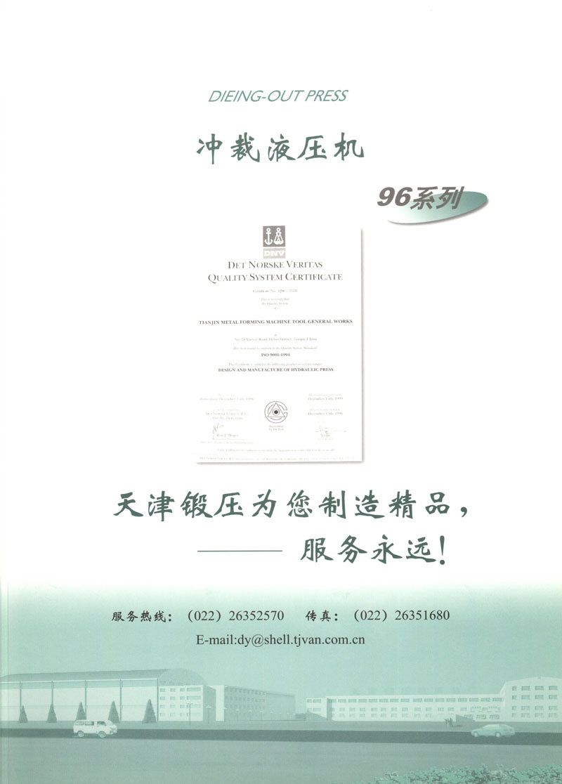 天津市鍛壓機(jī)床總廠是我國起步最早的企業(yè),現(xiàn)有固定資產(chǎn)2.4億元各類專業(yè)技術(shù)人員480人,是機(jī)械部大型骨干企業(yè)。自我廠自行設(shè)計(jì)國內(nèi)第一臺液壓機(jī),開創(chuàng)了我國中小型液壓機(jī)生產(chǎn)歷史以來,目前擁有26個(gè)系列,300余品種,產(chǎn)品從80KN至5000KN,以形成年產(chǎn)1200臺各類液壓機(jī)的生產(chǎn)能力,居國內(nèi)同行業(yè)之首。1983年YT32-315四柱液壓機(jī)獲國家銀牌,1990年YT32-630/1030雙動力拉伸液壓機(jī)一舉榮獲同行業(yè)唯一的國家金獎另有部優(yōu)產(chǎn)品3項(xiàng),市優(yōu)產(chǎn)品5項(xiàng)。產(chǎn)品廣泛適用于汽車制造、粉末冶金、金屬冷擠、輕工家電、化工機(jī)戒、航空航天、模具磨料、機(jī)戒制造等行業(yè),被國家指定為替代進(jìn)口產(chǎn)品,行銷全國,產(chǎn)品出口到日本、荷蘭、東南亞等20多個(gè)地區(qū)和國家、市場占有率居全國同行業(yè)第一。