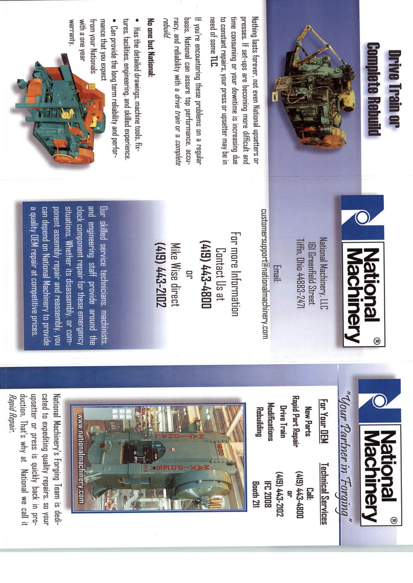 國(guó)家機(jī)械NationalMachinery是先進(jìn)的冷成型機(jī)械,工藝技術(shù)的全球領(lǐng)導(dǎo)者,和客戶支持的產(chǎn)品和服務(wù)。通過(guò)我們不斷的研究和發(fā)展,先進(jìn)的制造能力和銷售和服務(wù)遍布全球的網(wǎng)絡(luò),國(guó)家機(jī)器已經(jīng)牢固地確立了其作為“世界領(lǐng)先的金屬成形技術(shù)”的位置。