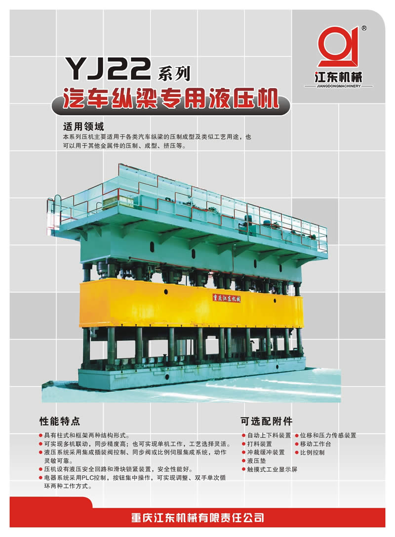 重慶江東機(jī)械有限責(zé)任公司位于中國(guó)目前最年輕的直轄市——重慶市萬(wàn)州區(qū)。江東機(jī)械最早由國(guó)民黨軍政部兵工署第27廠改制而成,1937年由南京遷入重慶,經(jīng)過(guò)70多年的發(fā)展,目前重慶江東機(jī)械已成為中國(guó)西部規(guī)模最大、實(shí)力較強(qiáng)的集液壓機(jī)研發(fā)、設(shè)計(jì)、制造、銷售和服務(wù)一體的大型裝備制造企業(yè)。公司占地456畝,擁有標(biāo)準(zhǔn)廠房8萬(wàn)余平方米,員工800多人,各類中高級(jí)技術(shù)人才150余人,各類專業(yè)加工設(shè)備200余臺(tái)(套),具備為用戶提供1000KN-100000KN的各種大型、精密液壓機(jī)及成套生產(chǎn)線的綜合能力。目前公司液壓機(jī)類產(chǎn)品有23個(gè)系列,200余種型號(hào),規(guī)格從1000kN至100000kN,適用于金屬材料的壓制、彎曲、翻邊、擠壓成型及非金屬材料如橡膠、塑料、玻璃鋼、絕緣材料和磨料制品的壓制成型,廣泛用于汽車、摩托車、五金、家電、軍工、航天、航空、船舶、鐵路機(jī)車、農(nóng)用機(jī)械、建材、冶金等等行業(yè),并已出口到韓國(guó)、日本、印度、巴基斯坦等多個(gè)國(guó)家和地區(qū)。公司為中國(guó)機(jī)床工具協(xié)會(huì)鍛壓機(jī)械分會(huì)常務(wù)理事單位,中國(guó)鍛壓協(xié)會(huì)會(huì)員單位,重慶市高新技術(shù)企業(yè);液壓機(jī)為重慶市名牌產(chǎn)品,江東機(jī)械為重慶市著名商標(biāo)。
