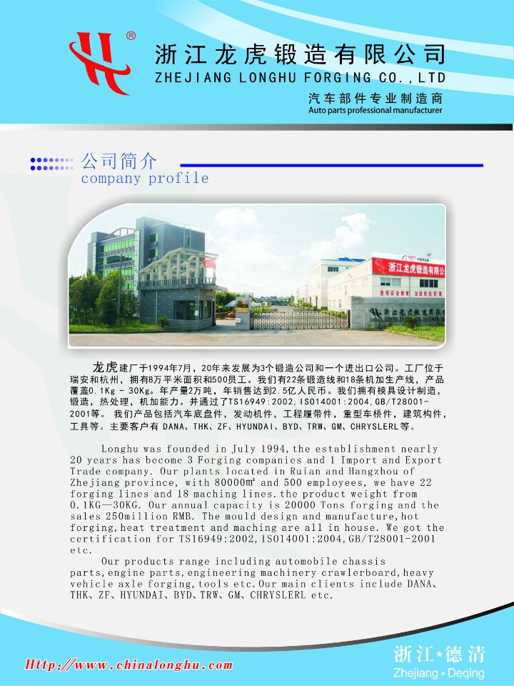 龍虎公司創(chuàng)立于1994年,其前身是瑞安龍虎鍛造廠,經(jīng)過(guò)十余年的拼搏和奮斗,目前已擁有浙江龍虎鍛造公司、瑞安龍虎鍛造公司、瑞安龍虎電氣公司、德清進(jìn)出口貿(mào)易公司等四個(gè)公司,成為我國(guó)制造業(yè)中專(zhuān)業(yè)從事汽車(chē)零件鍛造及機(jī)械加工的知名企業(yè)之一。公司總部坐落于風(fēng)景秀美人杰地靈的莫干山畔,德清縣干山工業(yè)區(qū)55號(hào),距杭州蕭山國(guó)際機(jī)場(chǎng)僅1小時(shí)車(chē)程,距上海或者寧波港僅2小時(shí)左右車(chē)程,左鄰寧杭高速鐵路德清站,地理位置優(yōu)越、物流交通便利。公司擁有一批高中級(jí)技術(shù)職稱為骨干的技術(shù)、管理人才和一支具有拼搏進(jìn)取、團(tuán)結(jié)、協(xié)作精神的優(yōu)秀員工隊(duì)伍,公司擁有專(zhuān)業(yè)鍛造生產(chǎn)線15條,年鍛造生產(chǎn)能力2萬(wàn)噸,產(chǎn)品及模具設(shè)計(jì)均采用CAD/CAM技術(shù),公司設(shè)有以機(jī)械加工中心及數(shù)控機(jī)床為主要設(shè)備的機(jī)械加工車(chē)間和以連續(xù)爐為主要設(shè)備的熱處理車(chē)間,以及專(zhuān)業(yè)的模具制造車(chē)間,公司擁有檢驗(yàn)和實(shí)驗(yàn)手段完善的質(zhì)量檢測(cè)中心。公司專(zhuān)業(yè)生產(chǎn)汽車(chē)配件、工程機(jī)械、五金工具及建筑構(gòu)件等四大類(lèi)。各機(jī)型產(chǎn)品1000余種,主導(dǎo)產(chǎn)品有:12T-18T平臺(tái)車(chē)車(chē)輪軸頭、凸輪軸、制動(dòng)器支架、凸輪軸支架、轉(zhuǎn)向節(jié)、半軸突緣、汽車(chē)懸掛、拉桿、發(fā)動(dòng)機(jī)汽門(mén)搖臂、汽車(chē)門(mén)鉸鏈及錨件、吊環(huán)等。產(chǎn)品不僅銷(xiāo)往國(guó)內(nèi)各知名主機(jī)企業(yè),在海外如德國(guó)、美國(guó)哥倫比亞、韓國(guó)、新加坡、泰國(guó)印度和臺(tái)灣等地也擁有廣泛的用戶。公司擁有完善、可靠的質(zhì)量保障體系、和完備的用戶服務(wù)體系,并先后通過(guò)了ISO9002;QS9000;ISO/TS16949;ISO14000/18000等體系認(rèn)證工作。公司全體員工牢固樹(shù)立了“用戶的需要就是我們的標(biāo)準(zhǔn)”的理念,愿以自己的優(yōu)良產(chǎn)品和優(yōu)質(zhì)的工作為更加廣泛的用戶,提供竭誠(chéng)周到的服務(wù)。