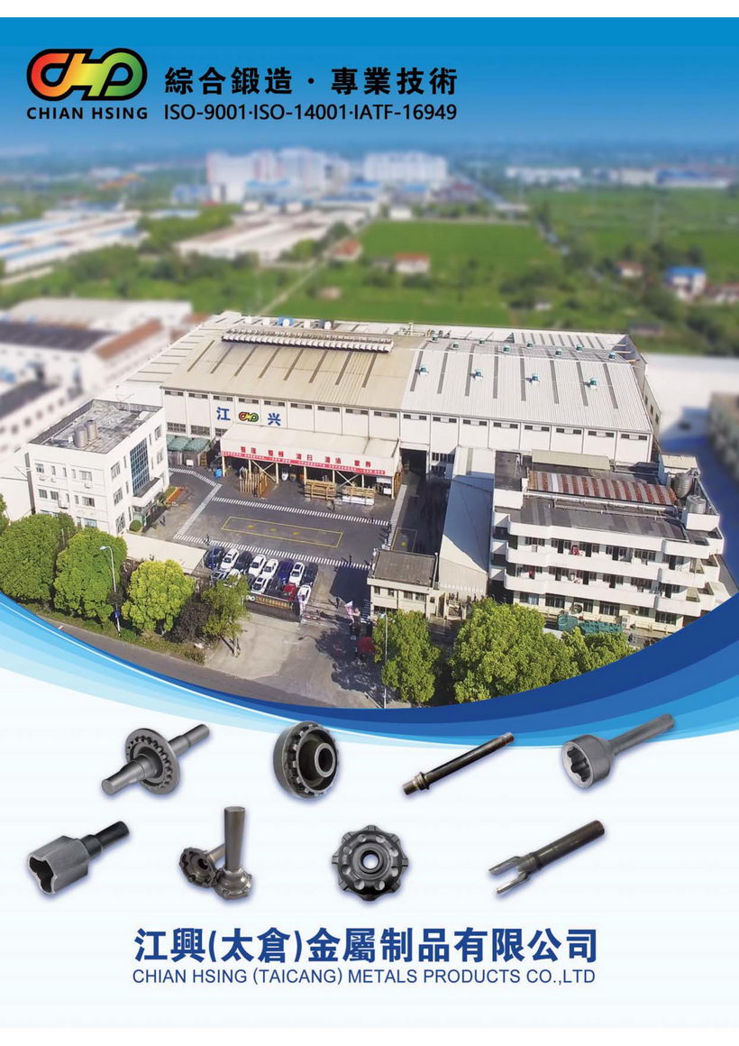 江興鍛壓工業(yè)股份有限公司自西元1971年創(chuàng)立以來,秉持著「顧客滿意、同仁樂意、經(jīng)營得意、永續(xù)經(jīng)營」之經(jīng)營理念,不斷開發(fā)綜合鍛造之技術(shù),使本公司所生產(chǎn)的鍛品更優(yōu)良、更精密、更能減少切削加工,使鍛品更臻于理想。于1997年在江蘇省太倉市設(shè)立江興(太倉)金屬制品有限公司,以及2012年設(shè)立江興(淮安)汽車部件有限公司,延續(xù)臺灣總部的經(jīng)營理念和專業(yè)技能,持續(xù)在國內(nèi)發(fā)展并精進(jìn)冷溫?zé)峋C合鍛造技術(shù)。