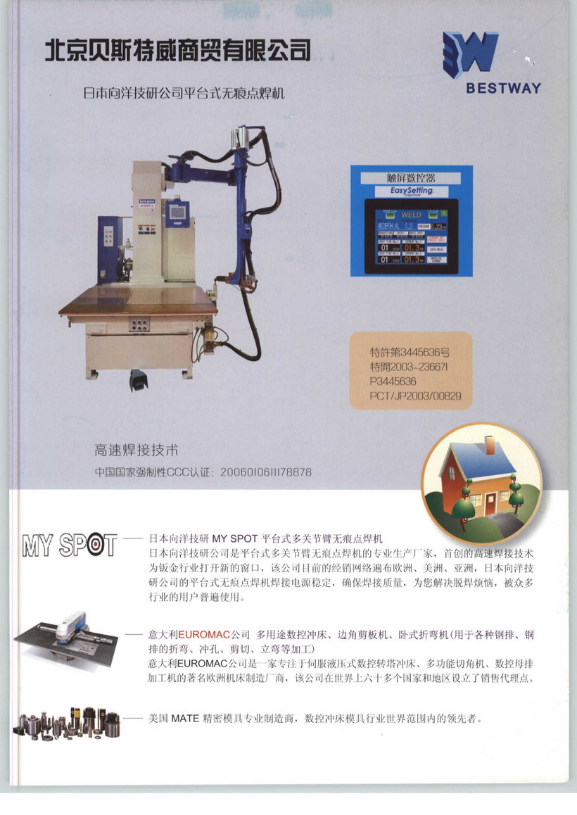 日本向洋技研MY SPOT 平臺(tái)式多關(guān)節(jié)臂無(wú)痕點(diǎn)焊機(jī)日本向洋技研公司是平臺(tái)式多關(guān)節(jié)臂無(wú)痕點(diǎn)焊機(jī)的專業(yè)生產(chǎn)廠家,首創(chuàng)的高速焊接技術(shù)為鈑金行業(yè)打開(kāi)新的窗口,該公司目前的經(jīng)銷網(wǎng)絡(luò)遍布?xì)W洲、美洲、亞洲,日本向洋技研公司的平臺(tái)式無(wú)痕點(diǎn)焊機(jī)焊接電源穩(wěn)定,確保焊接質(zhì)量,為您解決脫焊煩惱,被眾多行業(yè)的用戶普遍使用。意大利EUROMAC公司多用途數(shù)控沖床、邊角剪板機(jī)、臥式折彎?rùn)C(jī)(用于各種鋼排、銅