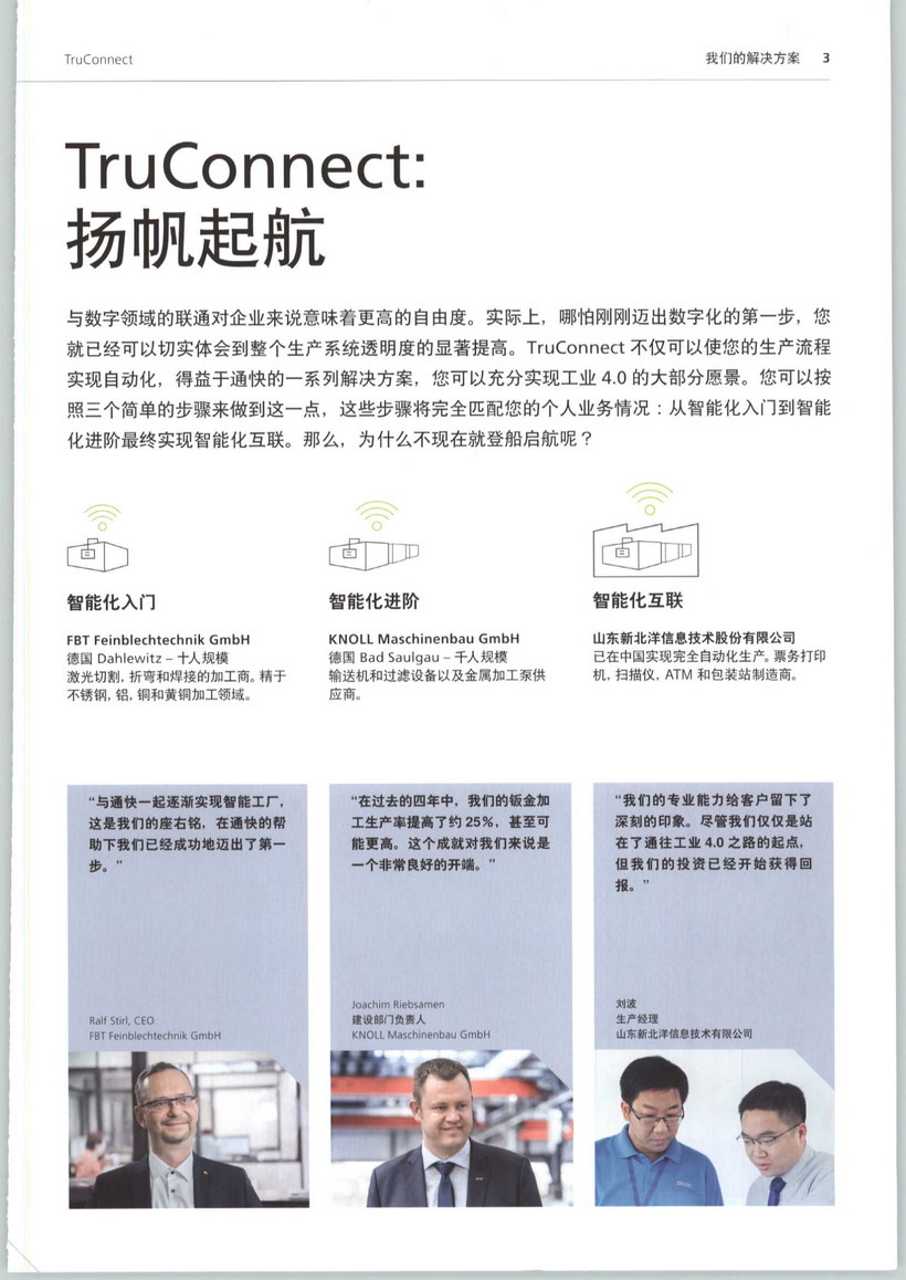 我們的任務(wù)在于進(jìn)一步發(fā)展生產(chǎn)技術(shù)并實(shí)現(xiàn)數(shù)字聯(lián)網(wǎng),使其更加經(jīng)濟(jì)、精確而又面向未來(lái)。為此,我們希望更為高效地規(guī)劃生產(chǎn)及其上游和下游工作流程。我們由此努力打造未來(lái)工業(yè)世界。作為工業(yè)生產(chǎn)領(lǐng)域機(jī)床與激光器的市場(chǎng)及技術(shù)雙優(yōu)企業(yè),我們的各項(xiàng)創(chuàng)新幾乎影響著各行各業(yè)。我們的軟件解決方案為打造智能工廠鋪平道路,在工業(yè)電子領(lǐng)域?qū)崿F(xiàn)高科技工藝。