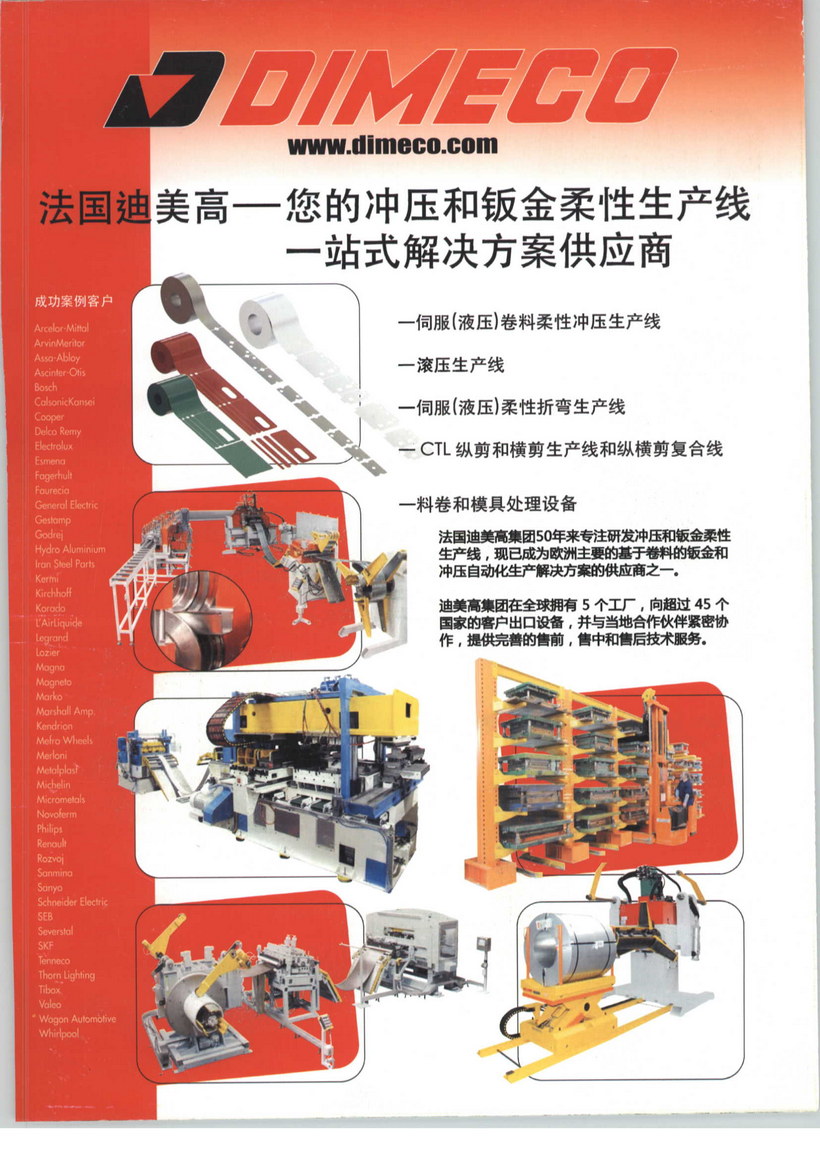 法國迪美高集團50年來專注研發(fā)沖壓和鈑金柔性生產(chǎn)線,現(xiàn)已成為歐洲主要的基于卷料的鈑金和沖壓自動化生產(chǎn)解決方案的供應商之一。迪美高集團在全球擁有5個工廠,向超過45個國家的客戶出口設備,并與當?shù)睾献骰锇榫o密協(xié)作,提供完善的售前,售中和售后技術服務。