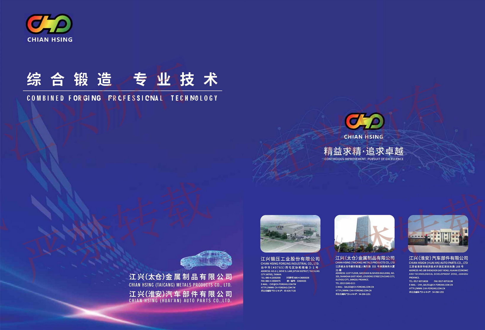 江興鍛壓工業(yè)股份有限公司自西元1971年創(chuàng)立以來(lái),秉持著「顧客滿(mǎn)意、同仁樂(lè)意、經(jīng)營(yíng)得意、永續(xù)經(jīng)營(yíng)」之經(jīng)營(yíng)理念,不斷開(kāi)發(fā)綜合鍛造之技術(shù),使本公司所生產(chǎn)的鍛品更優(yōu)良、更精密、更能減少切削加工,使鍛品更臻于理想。于1997年在江蘇省太倉(cāng)市設(shè)立江興(太倉(cāng))金屬制品有限公司,以及2012年設(shè)立江興(淮安)汽車(chē)部件有限公司,延續(xù)臺(tái)灣總部的經(jīng)營(yíng)理念和專(zhuān)業(yè)技能,持續(xù)在國(guó)內(nèi)發(fā)展并精進(jìn)冷溫?zé)峋C合鍛造技術(shù)。