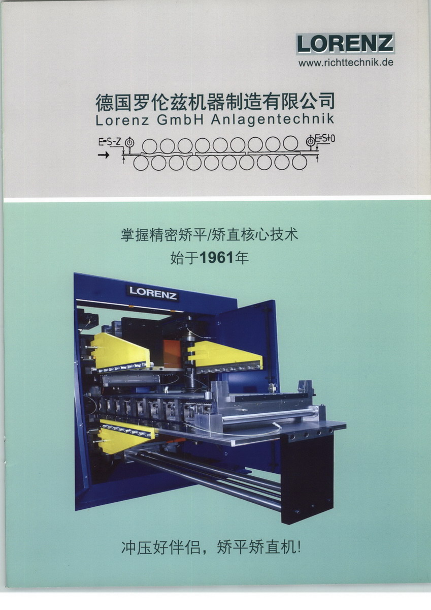 德國(guó)羅倫茲?rùn)C(jī)器制造有限公司由H. Lorenz先生于1988年1月1日創(chuàng)立,專業(yè)生產(chǎn)19/21輥精密矯平設(shè)備, 9輥矯直裝置, 開卷機(jī)和收卷機(jī), 電動(dòng)輥喂料器和橫向零件進(jìn)給裝置. 所有設(shè)備所需電氣,氣動(dòng)和液壓控制裝置也有我們自己的特點(diǎn). 我司是矯平矯直技術(shù)的創(chuàng)始人.