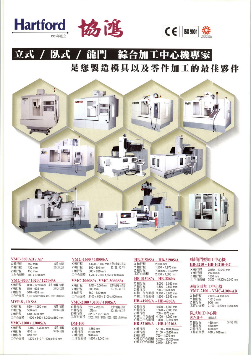 臺灣協(xié)鴻工業(yè)股份有限公司成立于1965年,公司位于臺灣省臺中市。創(chuàng)業(yè)45年以來,協(xié)鴻公司發(fā)展迅速,目前已成為臺灣最大的加工中心機(jī)專業(yè)制造廠,包含四個分廠,五百名員工,占地面積72500平方米,年產(chǎn)量2000臺以上。