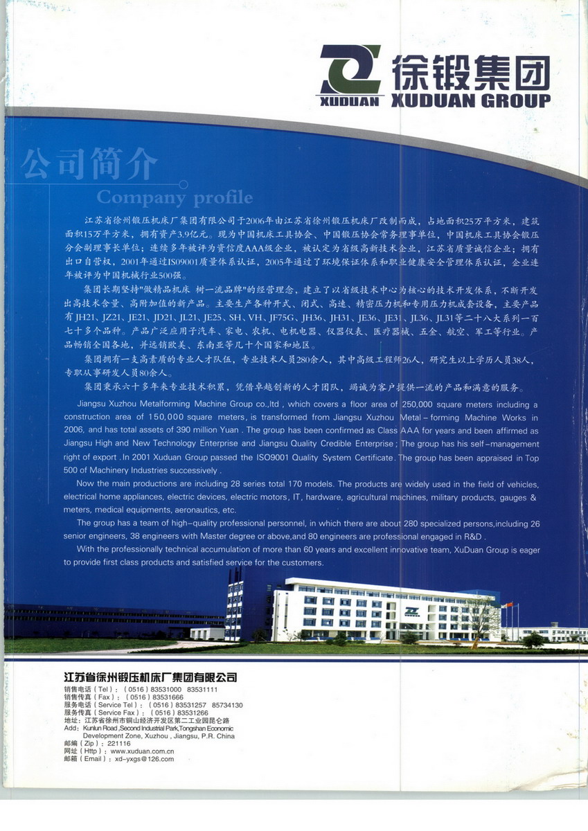 徐鍛占地面積25萬平方米,建筑面積15萬平方米;擁有資產(chǎn)4億元,連續(xù)多年被評為AAA級資信企業(yè),江蘇省質(zhì)量誠信企業(yè);2001年通過ISO9001質(zhì)量體系認(rèn)證,2005年通過環(huán)境保證體系和職業(yè)健康安全管理體系認(rèn)證;2006年被認(rèn)定為省級高新技術(shù)企業(yè);2007年被確定為江蘇省首批創(chuàng)新型試點企業(yè);2010年被確定為國家火炬計劃重點高新科技企業(yè); 2010 年我公司與華中科技大學(xué)聯(lián)合設(shè)立江蘇省企業(yè)院士工作站;2010年設(shè)立江蘇省博士后科研工作站;設(shè)有全國鍛壓機(jī)械標(biāo)準(zhǔn)化技術(shù)委員會數(shù)控高速壓力機(jī)工作組(SAC/TC220/WG1);2012年與中國礦業(yè)大學(xué)聯(lián)合設(shè)立江蘇省企業(yè)研究生工作站;2013年設(shè)立國家級博士后科研工作站,2013年被確定為江蘇省信息化與工業(yè)化示范企業(yè),2014年與南京農(nóng)業(yè)大學(xué)聯(lián)合設(shè)立江蘇省企業(yè)研究生工作站;擁有出口自營權(quán),連年被評為中國機(jī)械行業(yè)500強(qiáng)企業(yè)。