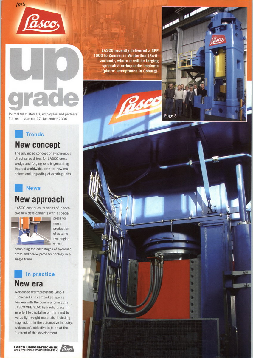 自從Langenstein和Schemann 1863年在德國科堡創(chuàng)立LASCO開始。LASCO就致力于在軍事、航天航空、汽車、船舶、化工、醫(yī)療、采礦和建筑工業(yè)領域為用戶提供最具現(xiàn)代化、最經(jīng)濟的鍛壓及成型設備生產(chǎn)線,LASCO產(chǎn)品以其高效率、高質(zhì)量和不斷創(chuàng)新而久負盛名。LASCO一向遵循市場的要求,不僅專注于鍛造及板材成型領域,LASCO設備在粉末冶金等特殊工業(yè)也廣泛應用。同時,在建筑新型墻體材料領域,LASCO設備及生產(chǎn)線也早已得到客戶的廣泛認可。