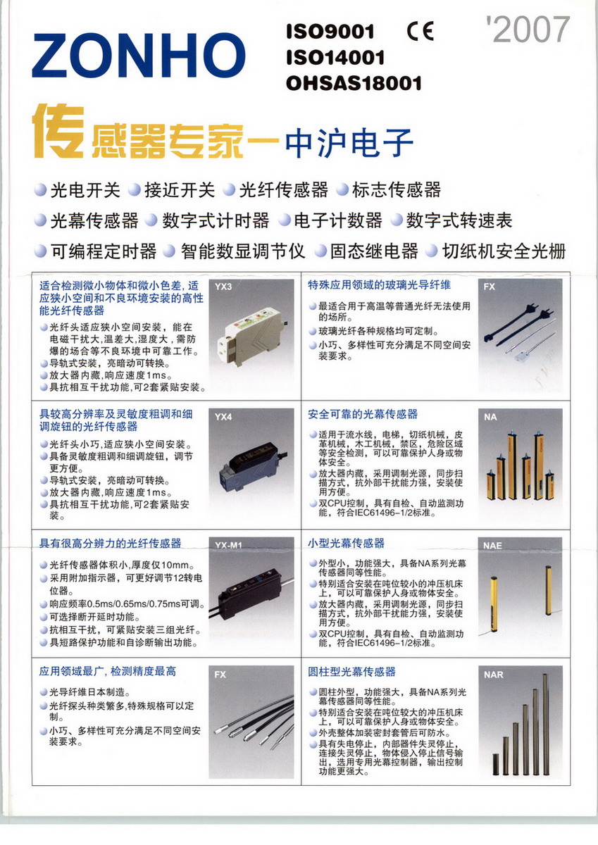 集四十多年專業(yè)研究、開發(fā)、生產(chǎn)之經(jīng)驗(yàn),中滬電子各系列的光電傳感器、接近傳感器、光纖傳感器、標(biāo)志傳感器、安全光幕傳感器、線性位移傳感器、數(shù)字式計(jì)時(shí)器、電子計(jì)數(shù)器、轉(zhuǎn)速表等,以其卓越的性能、穩(wěn)定的品質(zhì)、良好的服務(wù)及實(shí)惠的價(jià)格,贏得了越來越多客戶的信賴和鐘愛。