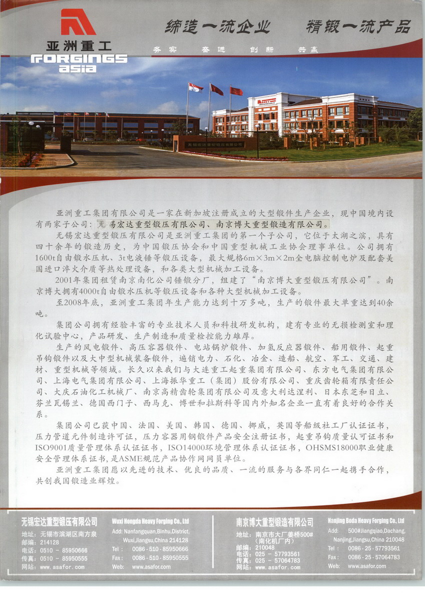 無錫宏達(dá)重型鍛壓有限公司是亞洲重工集團(tuán)的第一個(gè)子公司,它位于太湖之濱,具有四十余年的鍛造歷史,為中國鍛壓協(xié)會(huì)和中國重機(jī)協(xié)會(huì)理事單位。公司擁有1600t自由鍛水壓機(jī)、3t電液錘等鍛壓設(shè)備,最大規(guī)格6m×3m×2m全電腦控制電爐及配套美國進(jìn)口淬火介質(zhì)等熱處理設(shè)備,和各類大型機(jī)械加工設(shè)備。