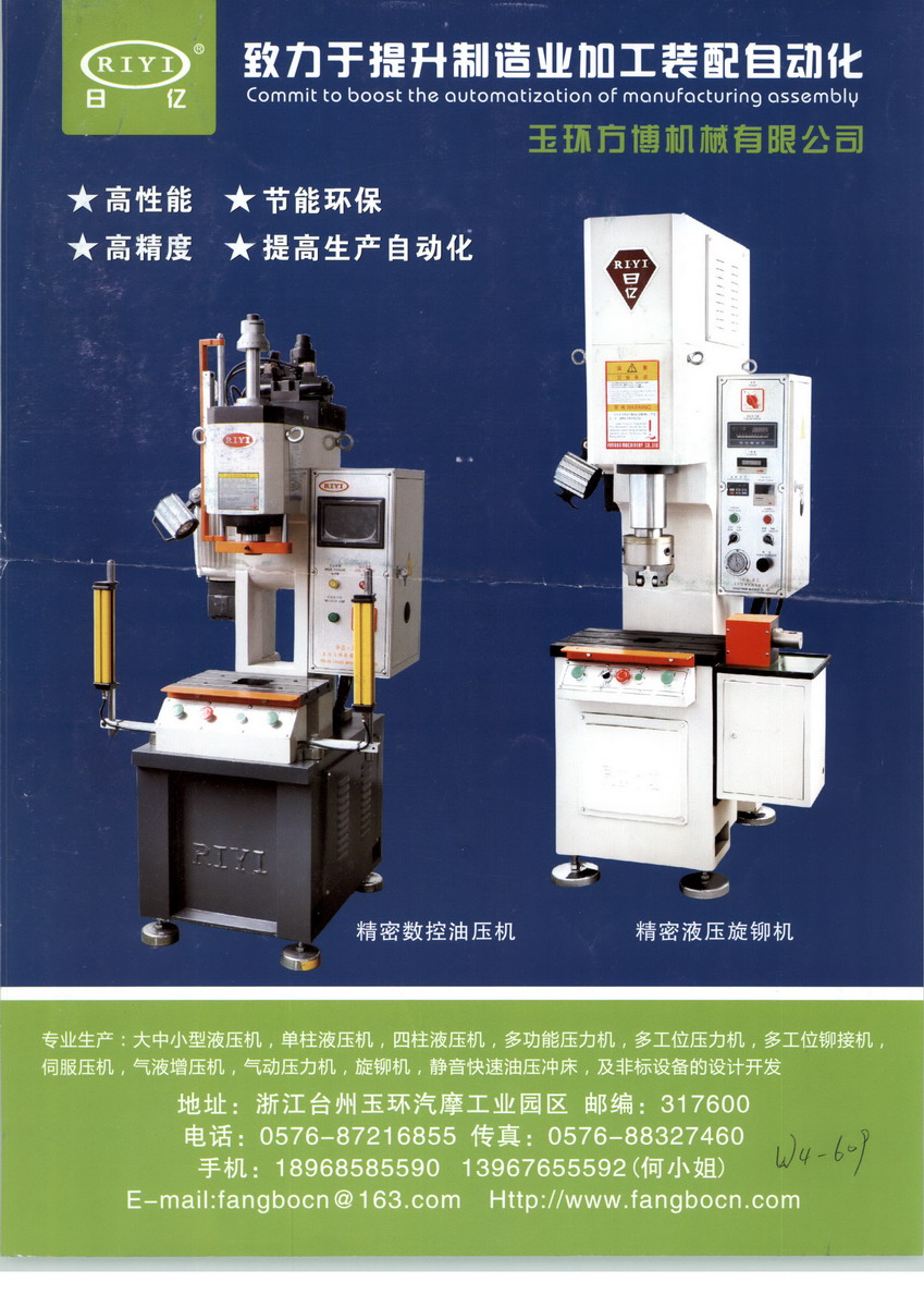 浙江玉環(huán)方博機械有限公司是一家專業(yè)致力于高速單柱液壓機、數(shù)控單柱液壓機、數(shù)控單臂液壓機、數(shù)控小型壓力機、中小型液壓機、單柱液壓機、單臂液壓機、四柱液壓機、數(shù)控液壓機、精密液壓機、全自動液壓機、旋鉚機,鉚接機、鉚釘機、小型壓力機、四柱油壓機、全自動油壓機、弓形油壓機、多功能液壓機、通用液壓機、多工位壓力機、轉(zhuǎn)盤式壓力機、伺服壓力機、伺服壓裝機、伺服沖床,電子壓裝機、伺服液壓機、伺服油壓機、電液伺服壓力機、氣液增壓機、氣動壓力機、氣動沖床、全自動旋鉚機、油壓沖床、數(shù)控油壓機、油壓拉伸機、及各種非標(biāo)壓力機的設(shè)計開發(fā)、制造與技術(shù)服務(wù)的高新技術(shù)企業(yè)。產(chǎn)品廣泛使用于汽車零部件,家電,五金,橡膠,粉末治金等行業(yè)的裝配-滾壓-拉伸成形-彎曲-鉚壓-熱壓-壓印等加工。本公司在引進(jìn)德國、日本等國家先進(jìn)的控制技術(shù)及機床設(shè)計理念的基礎(chǔ)上,結(jié)合國內(nèi)相關(guān)行業(yè)的實際需要,開發(fā)出各種臺式、落地式全系列機床。液壓密封件、氣動密封件、電磁閥、液壓缸等都選用國外知名企業(yè)品牌產(chǎn)品、部分選用國內(nèi)品牌。控制系統(tǒng)選用德國西門子PLC、日本歐姆龍、法國斯耐德等知名品牌的電器元件,使設(shè)備性能更加穩(wěn)定,操作方便。本公司機身等鑄件采用精密鑄造,高溫處理、去應(yīng)力退火、正火、自然時效處理等消除內(nèi)應(yīng)力,保證鑄件性能,防止鑄件變形和破壞,氣動床身采用QT450球墨鑄鐵并經(jīng)過各種必要的熱處理保證鑄件性能。本公司擁有一支專業(yè)從事專業(yè)機床設(shè)計、加工與維修服務(wù)的技術(shù)隊伍,能夠獨立完成機械結(jié)構(gòu)、電器與壓力控制系統(tǒng)的設(shè)計;并應(yīng)用現(xiàn)代優(yōu)化設(shè)計理念與分析軟件,進(jìn)行受力分析和優(yōu)化設(shè)計;能夠自主完成產(chǎn)品的全部機械加工與組裝調(diào)試,可以根據(jù)客戶需要進(jìn)行各種特殊的非標(biāo)準(zhǔn)機器與模具的設(shè)計和制作,產(chǎn)品生產(chǎn)周期短,并且提供運輸、安裝、調(diào)試等一條龍服務(wù)。本公司的產(chǎn)品曾出口美國,英國,法國,墨西哥,意大利,土耳其,日本,韓國,西班牙,德國,意大利,智利,埃及,泰國等等。玉環(huán)方博機械有限公司是壓力機、中小型液壓機、四柱液壓機、油壓機、氣壓機、增壓機、旋鉚機、多工位壓力機、全自動壓鉚機等產(chǎn)品專業(yè)生產(chǎn)加工的有限責(zé)任公司(自然人投資或控股),公司總部設(shè)在浙江玉環(huán)汽摩配工業(yè)園,玉環(huán)方博機械有限公司擁有完整、科學(xué)的質(zhì)量管理體系。玉環(huán)方博機械有限公司的誠信、實力和產(chǎn)品質(zhì)量獲得業(yè)界的認(rèn)可。歡迎各界朋友蒞臨玉環(huán)方博機械有限公司參觀、指導(dǎo)和業(yè)務(wù)洽談。