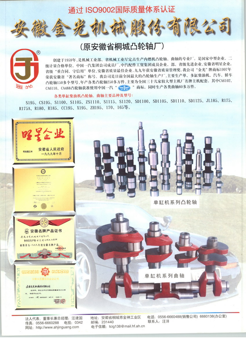 安徽金光機械股份有限公司是集研制、開發(fā)、生產、銷售于一體的國內最大的凸輪軸、曲軸、氣門等內燃機零部件專業(yè)公司,現(xiàn)為國家中型企業(yè),中國機械500強企業(yè),全國技術創(chuàng)新示范單位,安徽省高新技術企業(yè),安徽省明星企業(yè),部級、省級先進企業(yè),省質量最佳企業(yè),省質量管理獎單位,計量檢測體系二級確認合格企業(yè),農行“aaa”級資信單位,省級“誠信納稅企業(yè)”,省級“重合同,守信用”單位,中國汽配工貿集團企業(yè),iso9001:2000質量管理體系認證企業(yè),是具有自營進出口權資格企業(yè)。 公司占地面積25萬平方米,其中建筑面積8.5萬平方米,總資產1.5億元,其中固定資產1.2億元,擁有各類主要設備600臺(套),公司現(xiàn)有六部、十三個車間、十二個科室,公司現(xiàn)有員工1200余人,其中各類中、高級專業(yè)技術人員280余人。公司擁有現(xiàn)代化的凸輪軸、曲軸和氣門生產線,并從德國和美國分別引進了具有國際先進水平的cnc全數(shù)控凸輪軸加工、檢測中心。公司建有“省級技術中心”和cad工作站,擁有國內一流的科研開發(fā)人才隊伍。多年來,企業(yè)不斷加快新產品的研發(fā)和技術創(chuàng)新,推進名牌戰(zhàn)略的實施,積極運用現(xiàn)代企業(yè)制度,加強企業(yè)各項管理,各項經濟技術指標均名列全國同行業(yè)前茅,正跨入規(guī)模經營、規(guī)模效益的發(fā)展階段。