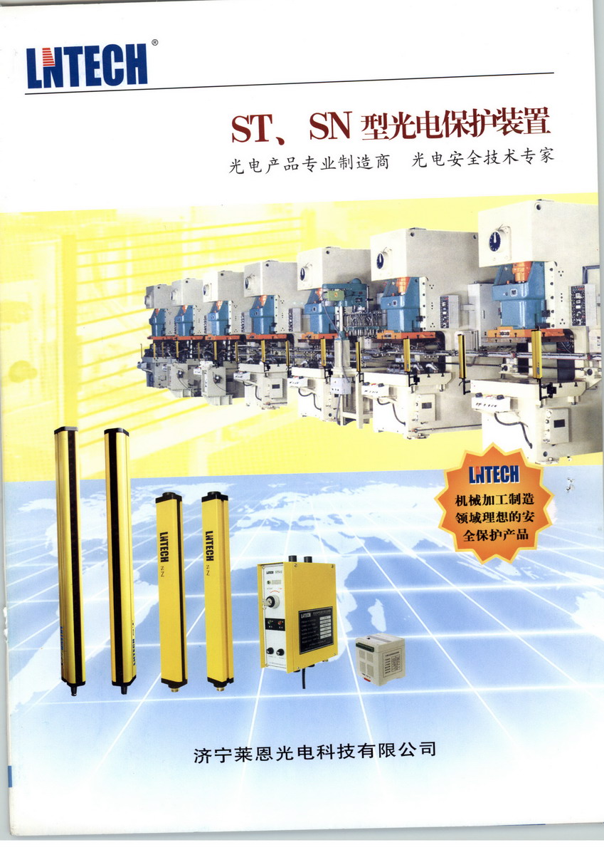 萊恩光電科技有限公司(華南)營銷中心是高起點、高標準的科技型企業(yè),主要從事光電安全產(chǎn)品的研發(fā)、制造和銷售,為機械加工、機械制造企業(yè)提供安全保護產(chǎn)品和安全技術(shù)解決方案。 專業(yè)的技術(shù),先進的設(shè)備,成熟的工藝、完善的質(zhì)量保證體系和豐富的安全保護從業(yè)經(jīng)驗,是我們?yōu)槟峁﹥?yōu)質(zhì)產(chǎn)品和服務(wù)的保證。 在現(xiàn)代化工廠里,人與機器協(xié)同工作,在一些具有潛在危險的機械設(shè)備上,如沖壓機械、剪切設(shè)備、金屬切削設(shè)備、自動化裝配線、自動化焊接線、機械傳送搬運設(shè)備、危險區(qū)域,易造成作業(yè)人員的人身傷害。 光電保護裝置,又稱為安全光幕、安全光柵、光電保護器,沖床安全保護器,壓力機安全保護裝置,機床安全保護器,是通過發(fā)射紅外線,產(chǎn)生保護光柵,當光柵被遮擋時,裝置發(fā)出遮光信號,控制具有潛在危險的機械設(shè)備停止工作,以降低作業(yè)人員在工作環(huán)境中受到傷害的可能性,有效保護作業(yè)人員的人身安全。 萊恩光電科技公司生產(chǎn)的光電保護裝置分為兩種類型五大系列:ST型光電保護裝置,又分為STF系列、STD系列、STQ系列 SN型光電保護裝置,又分為SNA系列、SNB系列,主要用于小型沖壓設(shè)備、剪切設(shè)備、機械加工設(shè)備、注塑機械、切紙機械、木工加工機械、立體車庫、以及其它危險區(qū)域的防護。 SN系列、ST系列光電保護裝置均具有以下特點: 1. 具有完善的自檢功能--當光電保護裝置失電或自身出現(xiàn)故障時,確保不向所控制的電器發(fā)出錯誤信號 2. 抗干擾能力強--對電磁信號、頻閃燈光、焊接弧光及周圍光源具有良好的抗干擾能力。 3. 使用壽命長--繼電器有效輸出次數(shù)大于100萬次,繼電器達到使用壽命后,可更換。 4. 具有良好的抗震性能--元器件焊接采用SMD技術(shù),并有多項抗震措施。 5. 可根據(jù)用戶要求設(shè)置自保功能--當光幕被遮擋時,壓力機滑塊停止運行,再次接通光線,壓力機不能 運行,必須按動復位按鈕后,壓力機滑塊才能再次啟動。 6. 規(guī)格品種多,最大限度的滿足您的要求。 7. 結(jié)構(gòu)簡單,接線方便--信號電纜采用航空插件連接。 8. 參照歐洲標準設(shè)計,安全可靠。 9. 快速響應(yīng)能力--響應(yīng)時間小于20ms,最大限度的避免了危險。 10.雙繼電器安全信號輸出,最大限度的增強了輸出信號的可靠性。 11.利用LED顯示工作狀態(tài)和故障狀態(tài),便于使用和故障判斷。 12.可提供NPN、PNP輸出,此時用戶應(yīng)保證機械設(shè)備的后續(xù)控制電路安全可靠。 13.需要保護的區(qū)域不在一個平面時(如同時需要垂直保護和水平保護),光電保護裝置可串聯(lián)使用。 14.通用性強,對光容易。