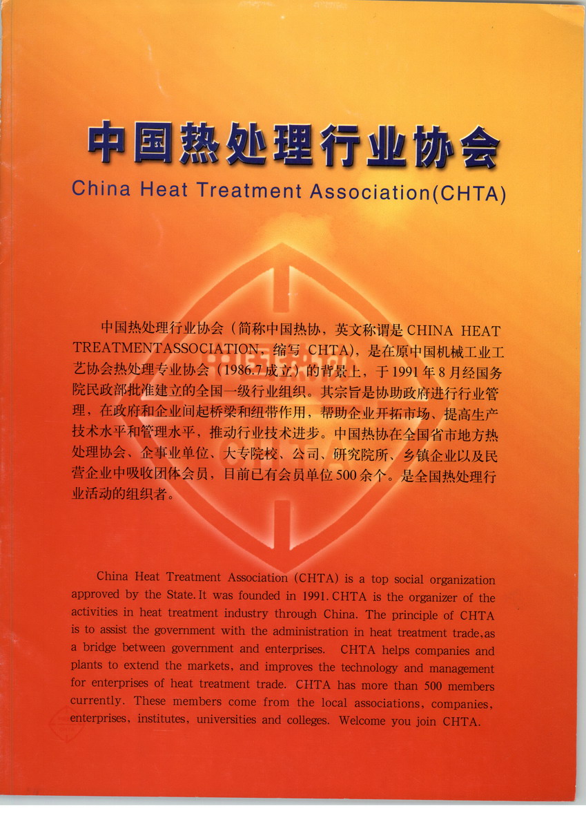 中國熱處理行業(yè)協(xié)會(簡稱中國熱協(xié),英文稱謂是CHINA HEAT TREATMENT ASSOCIATION,縮寫CHTA),是在原中國機(jī)械工業(yè)工藝協(xié)會熱處理專業(yè)協(xié)會(1986.7成立)的北景上,于1991年8月經(jīng)國務(wù)院民政部批準(zhǔn)建立的全國一級行業(yè)組織。其宗旨是協(xié)助政府進(jìn)行行業(yè)管理,在政府和企業(yè)間起橋梁和紐帶作用,幫助企業(yè)開拓市場、提高生產(chǎn)技術(shù)水平和管理水平,推動行業(yè)技術(shù)進(jìn)步。中國熱協(xié)在全國省市地方熱處理協(xié)會、企事業(yè)單位、大專院校、公司、研究院所、鄉(xiāng)鎮(zhèn)企業(yè)以及民營企業(yè)中吸收團(tuán)體會員,目前已有會員單位近1000余個(gè),是全國熱處理行業(yè)活動的組織者。