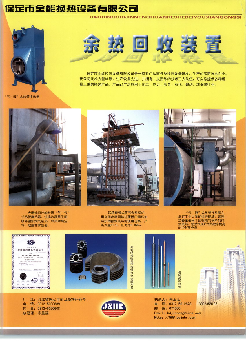 保定市金能換熱設(shè)備有限公司是由原保定市機(jī)械電器研究所改制組建而成。經(jīng)過多年奮斗,已發(fā)展成為一家專門從事各類換熱設(shè)備設(shè)計(jì)、生產(chǎn)的高新技術(shù)企業(yè)。公司下設(shè)空氣冷卻器、余熱回收裝置以及鍋爐壓力容器類產(chǎn)品制造三個(gè)事業(yè)部。公司擁有一支經(jīng)驗(yàn)豐富的從事?lián)Q熱節(jié)能和機(jī)電設(shè)備設(shè)計(jì)的專家隊(duì)伍,其中高級職稱人員8 名,中級職稱人員16名,同時(shí)長期聘請北京、天津地區(qū)大學(xué)教授及科研單位專家12名作為技術(shù)顧問,同時(shí)招收了一批近年畢業(yè)的大學(xué)畢業(yè)生并長期聘用,形成了一支新老結(jié)合,校企結(jié)合,具備雄厚技術(shù)實(shí)力的研發(fā)隊(duì)伍。經(jīng)過多年努力,公司取得了大量的科研成果,獲得了多項(xiàng)省部級科技進(jìn)步獎和節(jié)能獎,有多篇學(xué)術(shù)論文發(fā)表在國內(nèi)期刊和全國熱管會議上,公司具有完善的生產(chǎn)設(shè)施和過硬的生產(chǎn)隊(duì)伍。同時(shí)獲得了十三項(xiàng)換熱設(shè)備國家專利,即:一種淬火油冷卻和回收其余熱的熱管換熱設(shè)備 專利號:ZL 201310176520.3;淬火介質(zhì)空氣冷卻器 專利號:ZL 032 49016.X;感應(yīng)加熱設(shè)備全封閉空氣冷卻系統(tǒng) 專利號:ZL 2011 2 0319224.0;復(fù)合式熱管換熱設(shè)備 專利號:ZL 2007 2 0128522.5;帶有翅片的螺旋溝槽換熱管 專利號:ZL 2008 2 0132976.4;一種淬火油冷卻和回收其余熱的熱管換熱設(shè)備 專利號:ZL 201320259690.3;一種深度回收煙氣中冷凝水潛熱的燃?xì)忮仩t 專利號:201320712598.8;第三代煙氣余熱回收冷凝器專利號:ZL201420073823.2等。目前,公司可以設(shè)計(jì)生產(chǎn)多種節(jié)能、環(huán)保及高效的換熱設(shè)備。主要產(chǎn)品有三大類:空氣冷卻器、余熱回收設(shè)備及鍋爐、壓力容器這三大類的產(chǎn)品以及配件,包括冷卻各類介質(zhì)的空氣冷卻器、冷卻中高頻感應(yīng)加熱電源設(shè)備的空氣冷卻器及其他各種空氣冷卻器;余熱回收裝置、鍋爐、余熱鍋爐、各類余熱回收換熱器、冷凝器、加熱器、交換器、風(fēng)機(jī)、各類低中壓壓力容器、真空干燥機(jī)、熱風(fēng)爐等;高頻焊接不銹鋼(1Cr18Ni9Ti、0Cr18Ni9)、合金鋼(12Cr5Mo)及耐腐蝕的ND鋼和碳素鋼螺旋翅片管,并可按用戶要求生產(chǎn)加工各類換熱設(shè)備。公司研發(fā)的余熱回收熱管換熱器產(chǎn)品被國家工信部列入《節(jié)能機(jī)電設(shè)備(產(chǎn)品)推薦目錄》(第三批);空氣冷卻器產(chǎn)品被財(cái)政部、國家稅務(wù)總局、國家發(fā)展改革委關(guān)于執(zhí)行環(huán)境保護(hù)專用設(shè)備企業(yè)所得稅優(yōu)惠目錄,節(jié)能節(jié)水專用設(shè)備企業(yè)所得稅優(yōu)惠目錄和安全生產(chǎn)專用設(shè)備企業(yè)所得稅優(yōu)惠目錄,財(cái)稅〔2008〕48號文件;財(cái)稅〔2008〕115號文件。2010年空冷器產(chǎn)品被中國機(jī)械工業(yè)聯(lián)合會授予“機(jī)械工業(yè)節(jié)能機(jī)電產(chǎn)品” 稱號。2009年被中國熱處理行業(yè)協(xié)會列入《熱處理行業(yè)節(jié)能和清潔生產(chǎn)先進(jìn)技術(shù)與裝備目錄》公司的換熱設(shè)備已遍布全國二十幾個(gè)省、市、自治區(qū),部分產(chǎn)品已出口到泰國、土耳其、越南、日本等國家,用戶分布在石油、熱處理、化工、鋼鐵、冶金、汽車、電力、建材、輕紡、環(huán)保等行業(yè)。