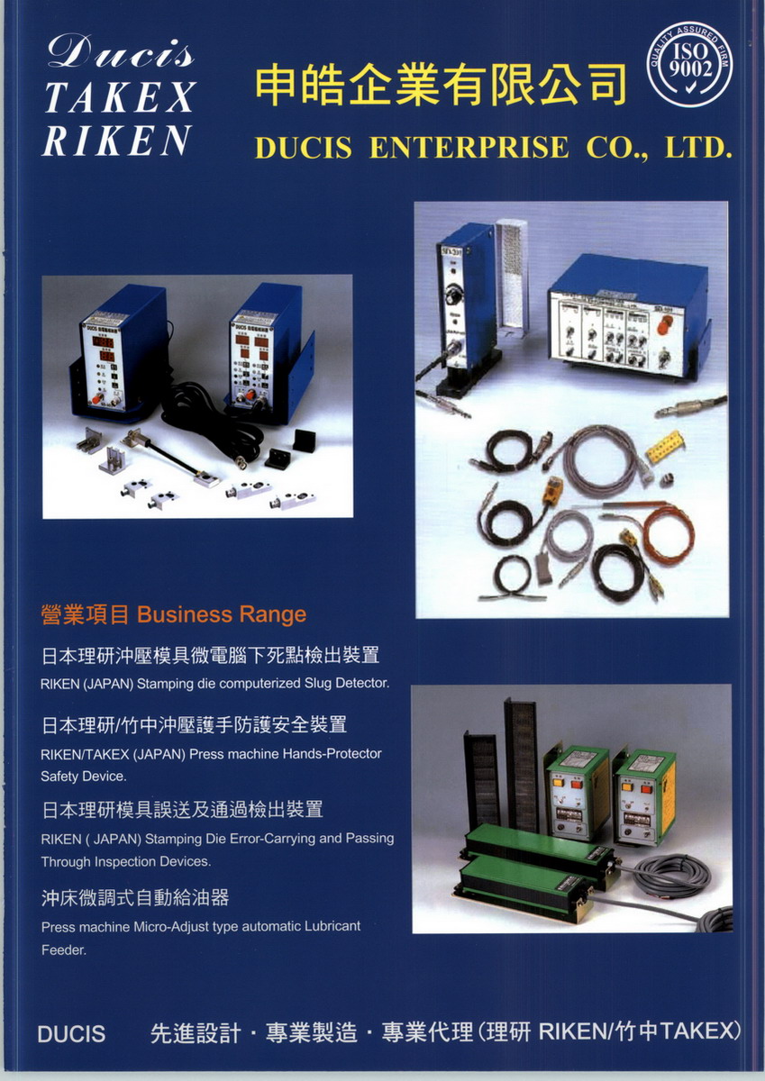 申皓企業(yè)有限公司於民國七十八年成立至今已有二十二年,公司參考先進(jìn)國家技術(shù),專業(yè)設(shè)計(jì)、製造生產(chǎn)與銷售沖床周邊自動化系列的機(jī)械設(shè)備。 主要生產(chǎn)微電腦下死點(diǎn)檢出器、模具誤送及通過檢出裝置、沖床護(hù)手防護(hù)安全裝置、不銹鋼附自動電磁閥給油桶。更是日本二大光電產(chǎn)品理研、竹中之代理商: 日本理研主要產(chǎn)品:沖床光電護(hù)手、荷重監(jiān)視器、誤送檢知、下死點(diǎn)檢知 日本竹中主要產(chǎn)品:沖床光電護(hù)手 申皓企業(yè)有限公司之產(chǎn)品行銷於世界各地,以優(yōu)良的品質(zhì)、熱忱、高效、優(yōu)質(zhì)的售後服務(wù) 而受到廣大客戶群的技持與愛護(hù),為滿足消費(fèi)者之需求及方便性,公司於東莞、昆山等地 設(shè)立分公司及辦事處,以便及時服務(wù)客戶。長久以來,因產(chǎn)品品質(zhì)的不斷改進(jìn)及定期 為客戶做產(chǎn)品檢修與服務(wù),得到客戶的大力支持與高度信賴,造就申皓在商業(yè)界的良好形 象。與此同時 ,產(chǎn)品的品質(zhì)也贏得了客戶的一致好評。