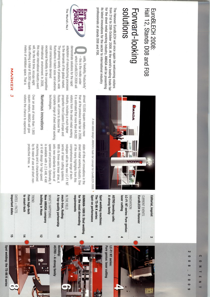 公司在世界各大洲設(shè)有83個(gè)分支機(jī)構(gòu),產(chǎn)品營(yíng)銷全球100多個(gè)國(guó)家和地區(qū),其生產(chǎn)鈑金加工機(jī)械的品種多 (達(dá)近千品種)性能之優(yōu),技術(shù)之先進(jìn),為世界鈑金加工機(jī)械的行業(yè)之首。公司在九十年代開(kāi)發(fā)制造的21世 紀(jì)智能化自動(dòng)鈑金加工中心,為世界鈑金行業(yè)的智能化加工開(kāi)創(chuàng)了一個(gè)先例,得到了日本最高的技術(shù)發(fā)明獎(jiǎng)勵(lì)。