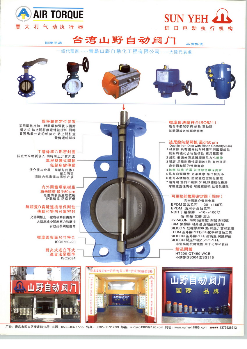 山野SUN YEH自動(dòng)閥門創(chuàng)業(yè)于1986年,從事研發(fā)、設(shè)計(jì)、制造,并在控制閥領(lǐng)域歷經(jīng)幾十年實(shí)踐,追求永無止盡之品質(zhì)改善,堅(jiān)持完美的設(shè)計(jì)理念,生產(chǎn)高性能的產(chǎn)品,通過銷售、積累了豐富的技術(shù)和經(jīng)驗(yàn),深受廣大用戶認(rèn)可。為更好適應(yīng)市場需要,青島山野自動(dòng)化工程有限公司于2008年引進(jìn)SUN YEH品牌的產(chǎn)品來大陸銷售推廣,設(shè)立總庫和技術(shù)中心。臺(tái)灣山野SUN YEH生產(chǎn)的四分之一轉(zhuǎn)(回轉(zhuǎn)型電動(dòng)執(zhí)行器),彈簧復(fù)歸(單作用電動(dòng)執(zhí)行器)及直線型電動(dòng)驅(qū)動(dòng)器,山野電動(dòng)執(zhí)行器主要特色之一是無離合器,既無須停電即可手動(dòng)操作,已獲多國專利。山野電動(dòng)驅(qū)動(dòng)器是建立于高品質(zhì)的水準(zhǔn)上,且獲得ISO9001、CE、CSA(符合屋外使用標(biāo)準(zhǔn))、ROHS認(rèn)證,『完美是我們唯一的堅(jiān)持』是山野一貫秉持的品質(zhì)目標(biāo)。臺(tái)灣山野SUN YEH電動(dòng)執(zhí)行機(jī)構(gòu)得到國內(nèi)外許多用戶和閥門廠商指定配套合作廠家。意大利AIR TORQUEs.p.A(簡稱AT)成立于1990年,是歐洲最大的專業(yè)從事氣動(dòng)閥門執(zhí)行器生產(chǎn)商。也是目前全球?qū)I(yè)生產(chǎn)氣動(dòng)閥門執(zhí)行器最大的廠家,年產(chǎn)最高量30萬臺(tái)。其生產(chǎn)的氣動(dòng)執(zhí)行器以規(guī)格齊全,性能優(yōu),質(zhì)量好,創(chuàng)新快的特點(diǎn),在全球擁有高知名度與極佳的評(píng)價(jià),成為著名的球閥、蝶閥生產(chǎn)商配套的首選產(chǎn)品。為更好的服務(wù)于廣大的客戶,授權(quán)青島山野自動(dòng)化工程有限公司為一級(jí)代理商。同時(shí)公司也是日本西部電機(jī)seibu-wonder多回轉(zhuǎn)型TM系列電動(dòng)執(zhí)行器的一級(jí)代理商。 青島山野提供的電動(dòng)執(zhí)行器、氣動(dòng)執(zhí)行器、控制閥及控制閥附件產(chǎn)品均符合國際通用標(biāo)準(zhǔn),如ISO、DIN、ASTM、BS、JIS等,被廣泛用于造紙、石油、化工,環(huán)保、醫(yī)療、制藥、冶金、食品、飲料、發(fā)電、供水、水處理、中央空調(diào)及工業(yè)氣體等領(lǐng)域。還可承接控制閥維修及手動(dòng)改自動(dòng)業(yè)務(wù),我們有先進(jìn)的校正儀器和研磨平臺(tái)來管控,用試壓設(shè)備和流量測試臺(tái)來保證每一臺(tái)維修和技改后控制閥的性能。青島山野執(zhí)著追求“用戶就是老板”的經(jīng)營理念,首要目標(biāo)是使顧客滿意。我們以全員品管為基礎(chǔ),通過高性能、創(chuàng)新的產(chǎn)品、優(yōu)良的品質(zhì)、大量庫存和交貨快速的服務(wù)來實(shí)現(xiàn)這一目標(biāo),而且我們是作為一個(gè)團(tuán)體來實(shí)現(xiàn)這一目標(biāo)。盡心盡力為客戶提供優(yōu)質(zhì)的產(chǎn)品和完善的售后服務(wù),誠心誠意尋求合作伙伴共同開發(fā)自動(dòng)閥門市場,滿足客戶需求。青島山野自動(dòng)閥門產(chǎn)品,必定會(huì)在您的自動(dòng)化控制糸統(tǒng)上發(fā)揮重大作用,愿通過產(chǎn)品的橋梁來連接你我之間的友誼。