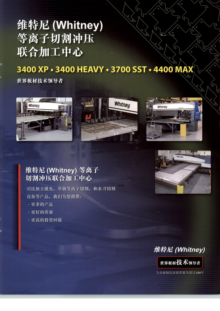 美國(guó)維特尼Whitney成立于1907年,擁有103年的歷史。世界板材技術(shù)的領(lǐng)導(dǎo)者,為金屬制造商提供服務(wù)超高100年的歷史。美國(guó)維特尼等離子切割沖壓聯(lián)合加工中心,它可以對(duì)2-25mm的板材直接進(jìn)行沖壓成型。它加工零件的速度比單獨(dú)激光、等離子切割設(shè)備,或水切割設(shè)備要快很多。維特尼加工中心通過(guò)沖孔,等離子切割外型,迅速完成一個(gè)零件的加工,并且提供了高質(zhì)量的產(chǎn)品保證。維特尼加工中心還能提供特殊的成型加工,如沉孔和花紋鋼板的加工。維特尼3400XP型號(hào)的等離子加工中心,它可以加工的鋼板尺寸在12x1500x3000毫米。我們還有其他型號(hào)可供選擇,可以加工鋼板厚度達(dá)到2-25毫米,以及2500x6000毫米尺寸的等離子加工中心。維特尼保持著完整的板材加工設(shè)備產(chǎn)品線,其產(chǎn)品廣泛應(yīng)用于全球的運(yùn)輸設(shè)備、電氣開關(guān)設(shè)備、回收設(shè)備、農(nóng)業(yè)機(jī)械及建筑機(jī)械等行業(yè)。